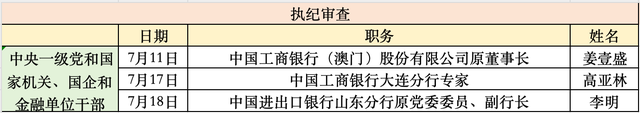 具体看,被查的3人中,有2人来自工商银行,分别为中国工商银行(澳门)股份有限公司原董事长姜壹盛,中国工商银行大连分行专家高亚林;1人来自进出口银行,为中国进出口银行山东分行原党委委员、副行长李明。
