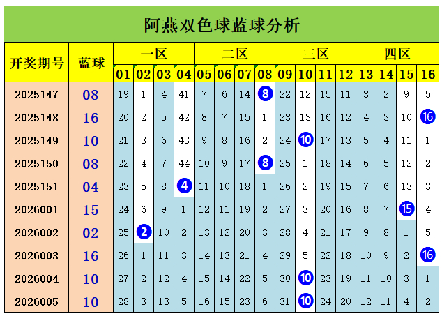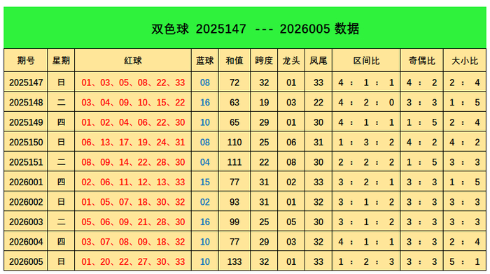 上期回顾:双色球第2026005期开出奖号:红球01、20、22、27、30、33;蓝球10,其中红球三区比为1:2:3,奇偶比3:3,大小比为5:1,蓝球开出1路号码10。