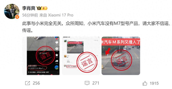 11 月 26 日,小米汽车副总裁李肖爽在个人社交平台再度发文辟谣,针对网传 “小米汽车 M7 撞人” 的说法及相关视频明确回应:“此事与小米完全无关,众所周知,小米汽车没有 M7 型号产品,请大家不信谣、不传谣”。