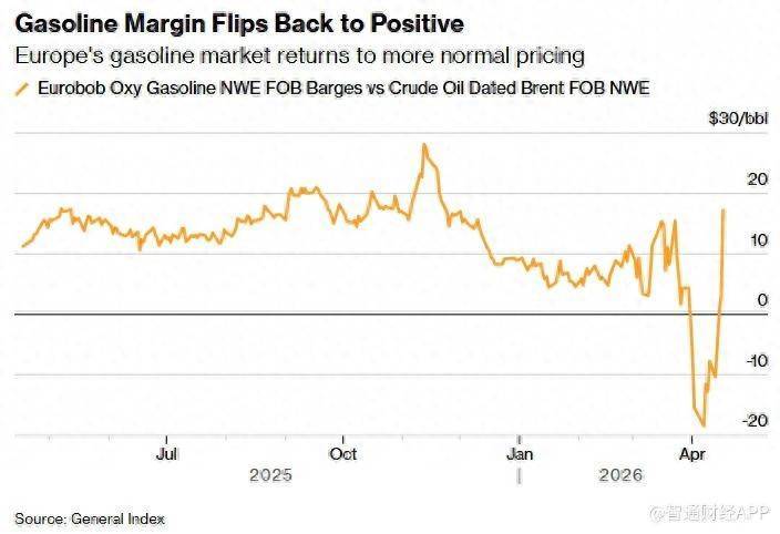 智通财经APP获悉,在美以对伊战争推高油价、挤压炼油利润之后,汽油市场出现剧烈反转。最新数据显示,欧洲汽油相对于原油的溢价录得历史最大单周涨幅,为炼油企业带来明显提振。