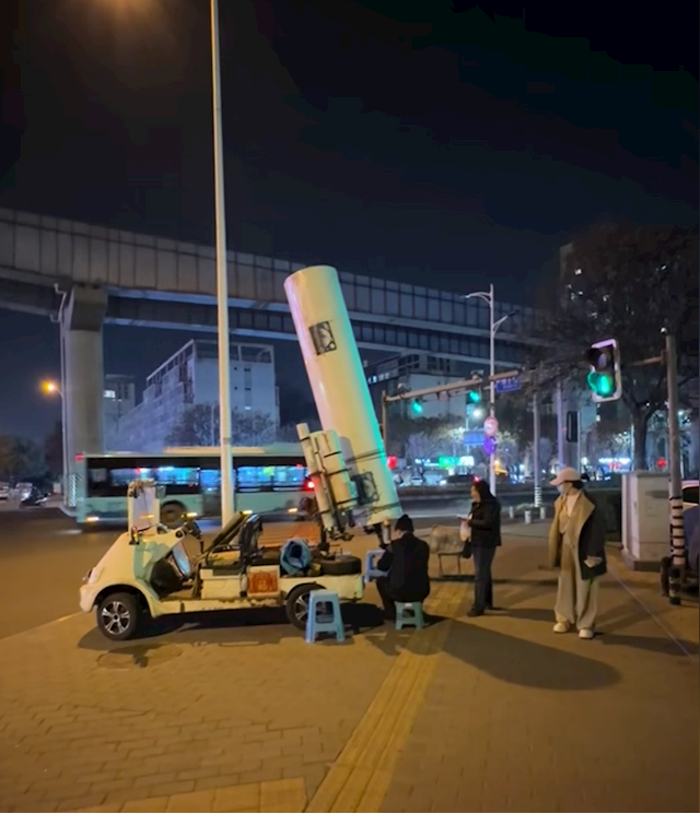 为补贴生计,平日里大爷会将这台车载天文望远镜摆在路边,收费数十元为路人提供观星服务,霸气的外形也让其吸引了不少关注。